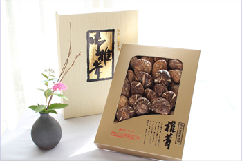 傘が開ききらないうちに収穫した肉厚で丸みのある冬(どんこ)。気象条件が揃ったときにだけ収穫できるため高級品とされ、進物に使われています。