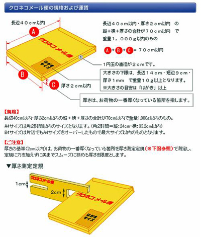 【クロネコメール便】(160円) 右図にある様、厚さ2cmまでの商品が対応可能となります。 主に「海苔500円・1000円お試しセット」や「ご家庭用海苔」が対象となります。