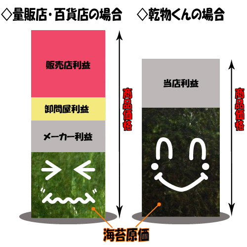 通常、スーパーや百貨店で 売られている商品は 「メーカー利益」「卸問屋利益」 「販売店利益」が上乗せ されて店頭に並んでいます。 乾物くんでは、すべて自社で行う ことにより 単純にお値打ち価格で お客様にご提供致します。 | ![]() |