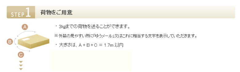 下図にある様、大きさが1.7m。重さが3kgまでの商品が対応可能となります。 主に「ご家庭用椎茸」や「メール便対応商品を同梱した物」が対象となります。 |