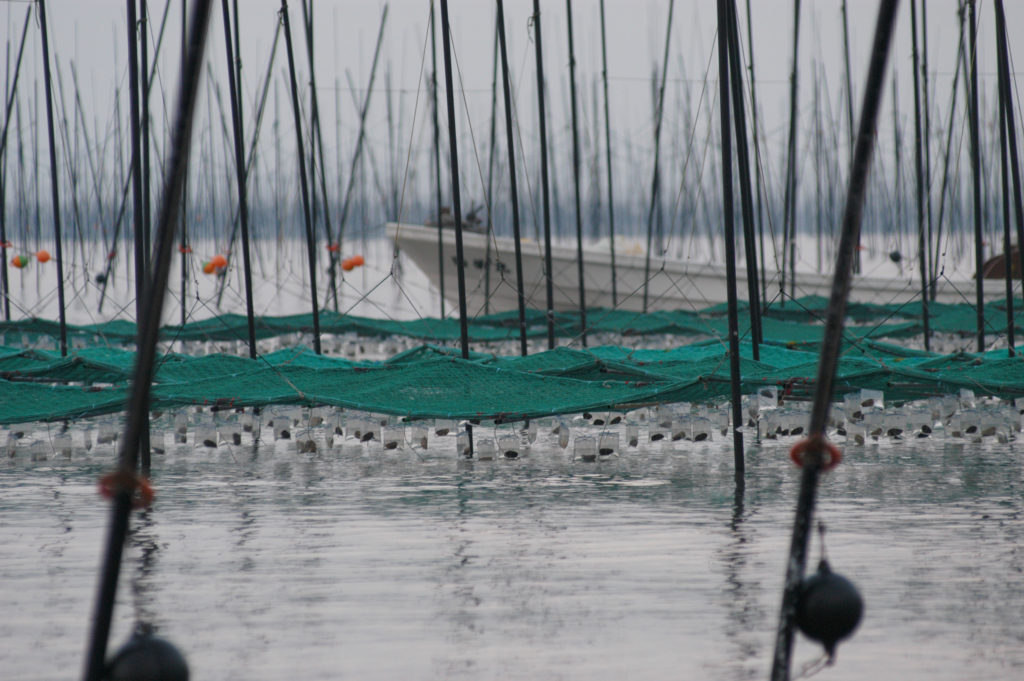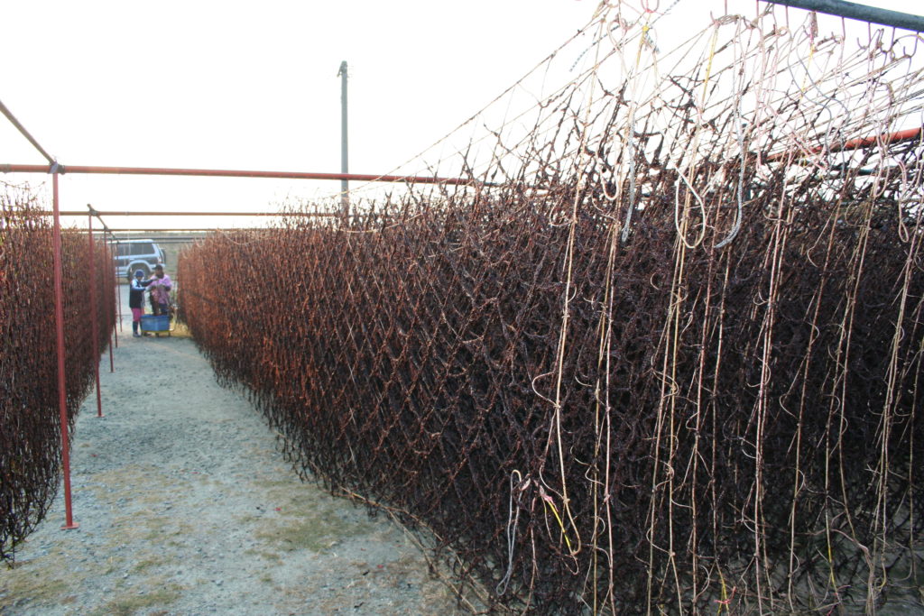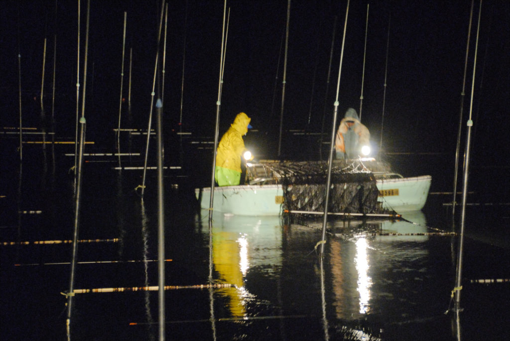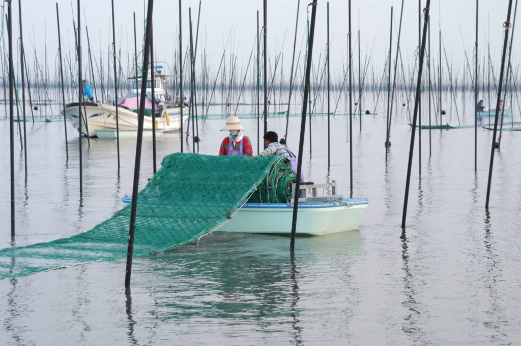 10月になると「採苗」がはじまり、30枚重ねた海苔網に、「ラッカサン」と呼ばれる小さなビニール袋をつけ、貝殻糸状体を1,2個と海水を入れて、船で漁場に運び、支柱にくくりつけます。