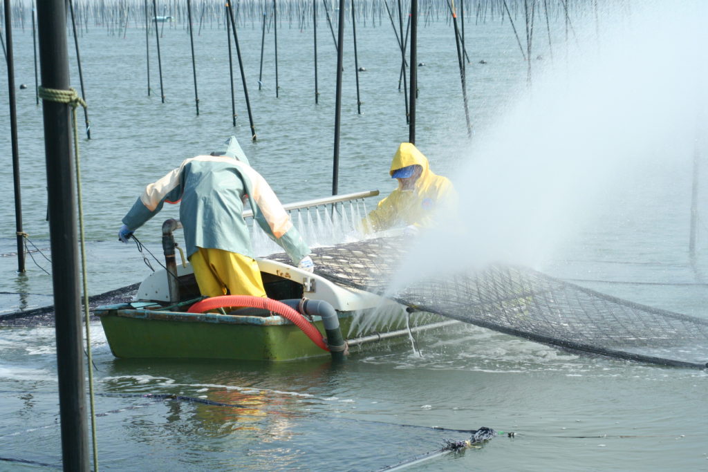 殻胞子の付着が確認できたら、ラッカサンをはずします。「網洗い」は育苗期の重要な作業で、網の汚れをジェット水流で落とし、ノリ芽の成長を助けます。