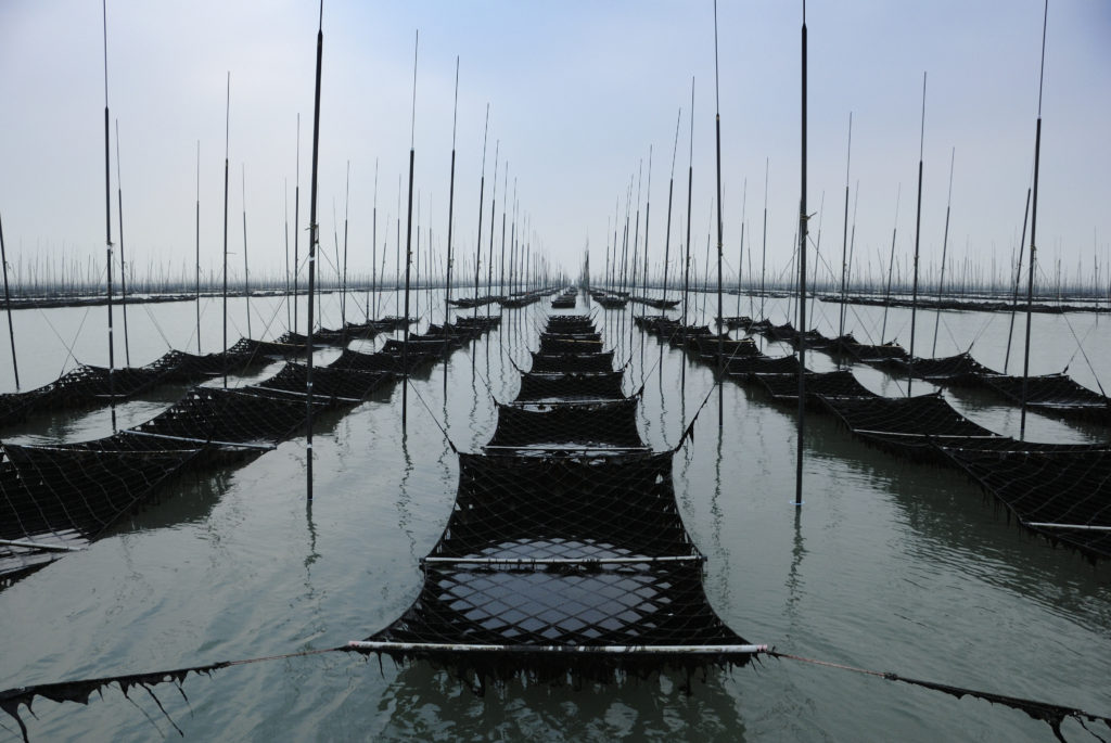 有明海の海苔には、海底に支柱を建て込む「支柱式養殖」で養殖されています。漁師さん一軒で1,000本もの支柱を海底に建て込み、網を張ります。