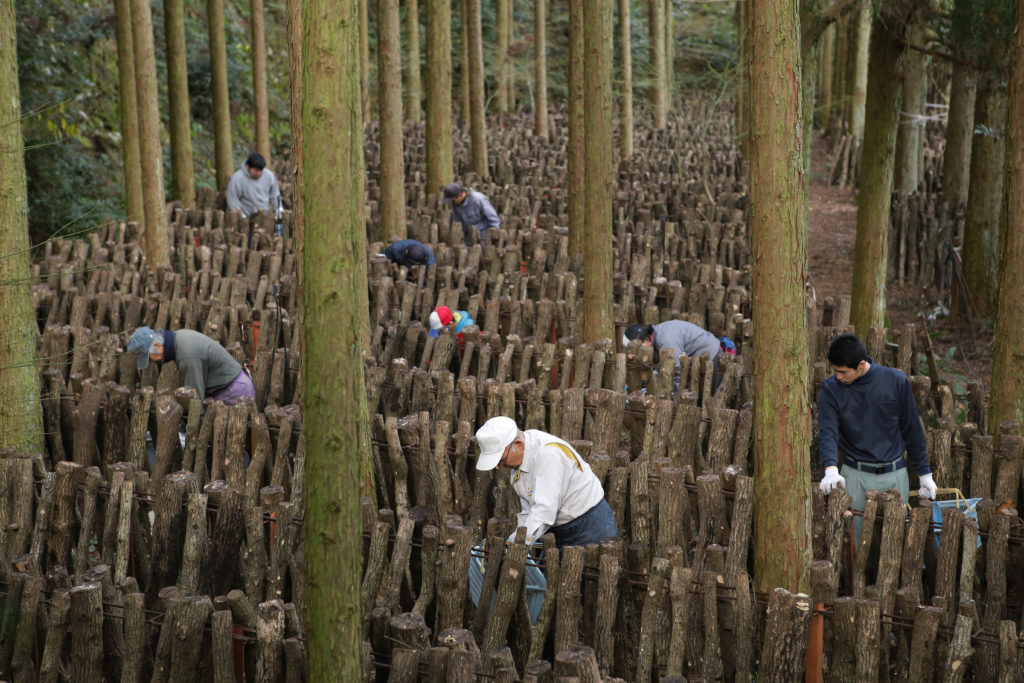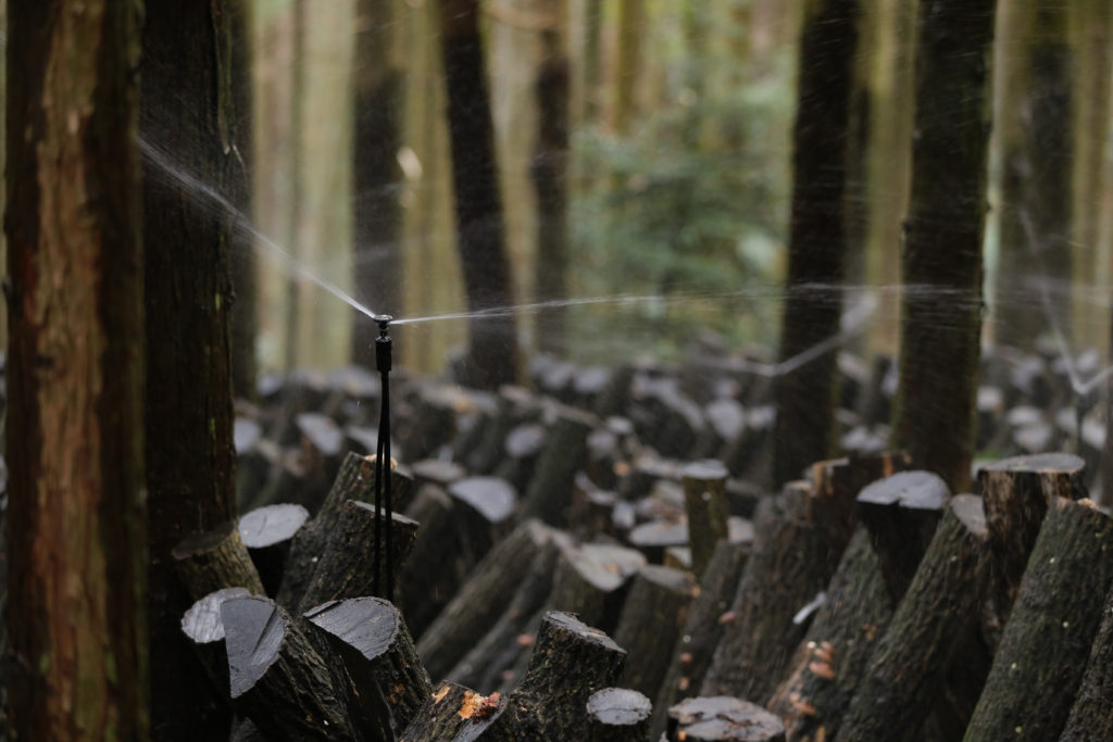 杉に囲まれほどよい木漏れ日があたる山の中。1本1本の原木を並べ近くの水源から水を引きしいたけを育てています。